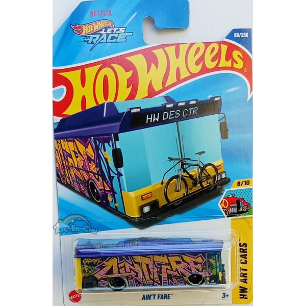 Le véhicule miniature de la célèbre gamme Hot Wheels de Mattel reprend à l'échelle 1:64 les lignes du Ain't Fare. Ce véhicule de la Mini Collection HW Art Cars représente le modèle N (8/10) (88/250) de l'assortiment C4982 de la gamme Hot Wheels sous la référence Mattel HYX32.